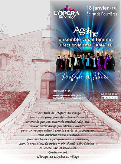 20€L’association ‘l’Opéra au village’ vous propose de célébrer ce début d’année avec l’ensemble vocal féminin AGATHE sous la direction de Michel Camatte et son répertoire très éclectique allant de la musique baroque jusqu’à celle du XXIe siècle.